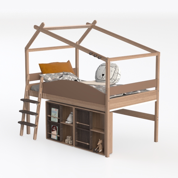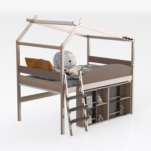 Ideal for fostering both rest and play, it pairs beautifully with plush, pastel-hued bedding, fuzzy animal-shaped cushions, and woven rugs, enhancing its whimsical vibe. Below the bed, open shelves and closed cabinets offer ample storage for storybooks, stuffed toys, and small treasures, keeping the room organized without sacrificing its playful spirit. A sturdy, low ladder provides easy access to the elevated sleeping area, while the enclosed roof creates a cozy, private nook where kids can dream, read, or simply unwind. This design balances functionality with heart, making it more than just furniture—it’s a gateway to imagination.