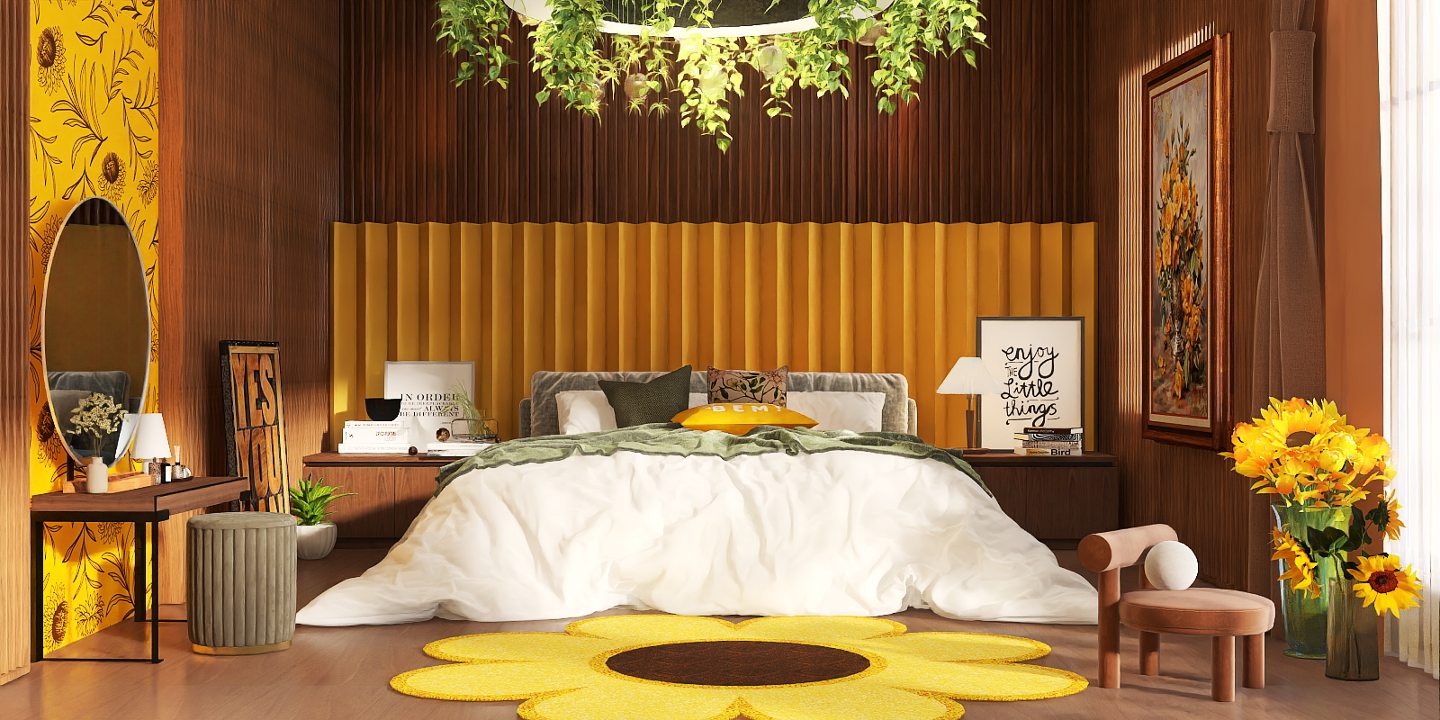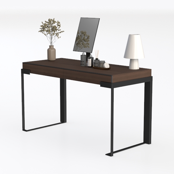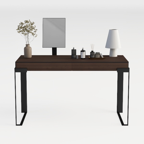 Inspired by the balance of natural warmth and structured minimalism, this piece merges organic textures with clean lines. The tabletop, crafted from rich, matte wood, offers a smooth, cool-to-touch surface with delicate, visible grain patterns that add subtle depth—warm yet not overwhelming. Its deep brown hue contrasts softly with the slender, matte black metal legs, which feature a sleek, angular design, balancing stability with a light, unobtrusive presence. A flat, frameless mirror sits at the back, reflecting ambient light to brighten the space, while a small, earthy-toned vase with dried florals and a matte white lamp with a conical shade introduce gentle, natural accents, enhancing the overall calm, cohesive vibe.