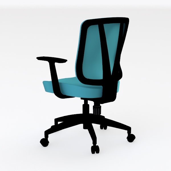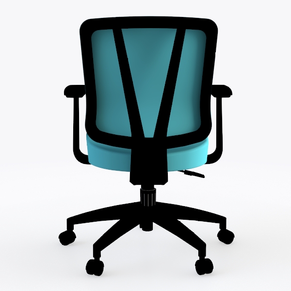 A modern office chair with a sleek silhouette, featuring a soft blue backrest and seat paired with a matte black frame. Its design draws inspiration from the need to merge functional work support with contemporary aesthetics, catering to modern workspaces that prioritize both productivity and comfort. The blue upholstery, likely crafted from breathable mesh, offers a lightweight, cool touch against the skin, while the curved backrest gently conforms to the spine, ensuring comfort even during extended hours of use. The black frame, with its angular armrests and streamlined lines, adds a bold, minimalist contrast, making the chair visually striking yet unobtrusive.