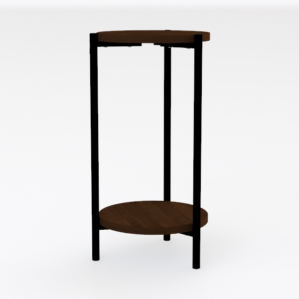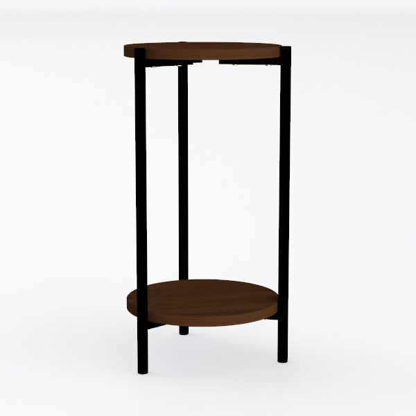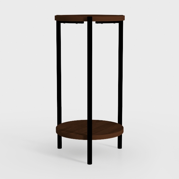 The upper and lower circular tabletops showcase a rich, warm walnut hue, preserving delicate wood grain textures that add depth and character. Their smooth, sanded surfaces invite gentle contact, offering a tactile contrast to the cool, matte black metal frame. The frame’s slender, tapering legs—elegant yet sturdy—support the structure with quiet confidence, while the overall silhouette remains light and airy, avoiding overwhelming presence in small spaces.