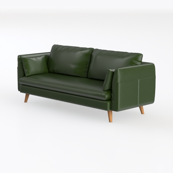 The sofa is upholstered in a soft, high-quality leather that offers a luxurious tactile experience. Its smooth texture invites you to sink into its plush cushions, while the rich green hue adds a pop of color to any room. The warm wooden legs provide a beautiful contrast, grounding the piece and contributing to its overall elegance.
