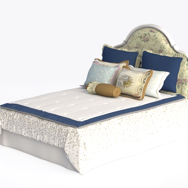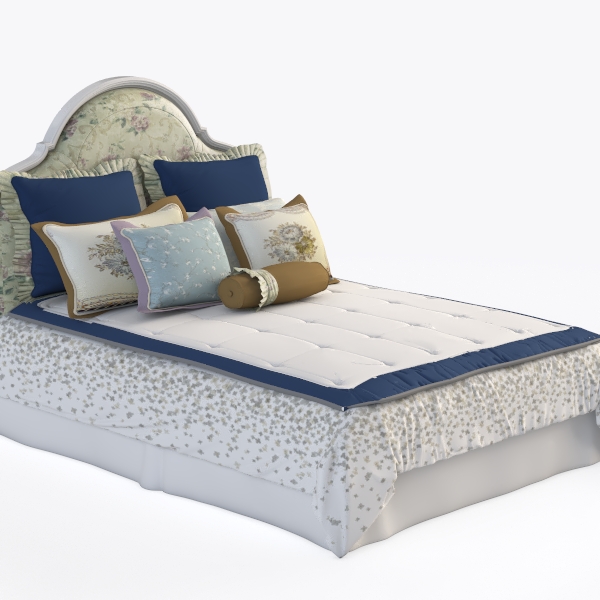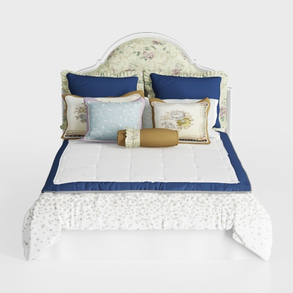 Inspired by the delicate beauty of cottagecore aesthetics and soft, romantic design traditions, this bed blends timeless charm with modern comfort. The headboard, curved and elegant, features a subtle floral print in muted watercolor tones on a textured, linen-like fabric, evoking the warmth of sunlit gardens and handcrafted artistry. The crisp white quilt, paired with deep blue bed runners that drape gently to the floor, creates a fresh, airy contrast, while the bedskirt—adorned with tiny, scattered star patterns in a soft, pearlescent hue—adds a playful, whimsical touch.