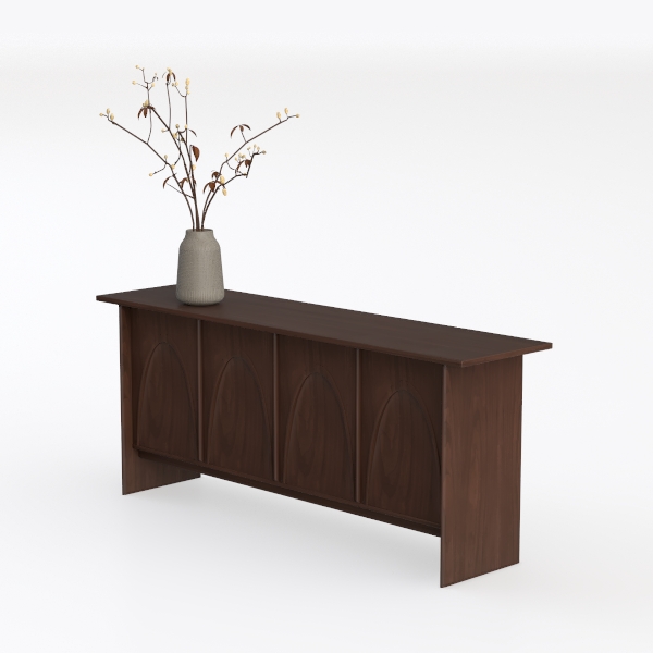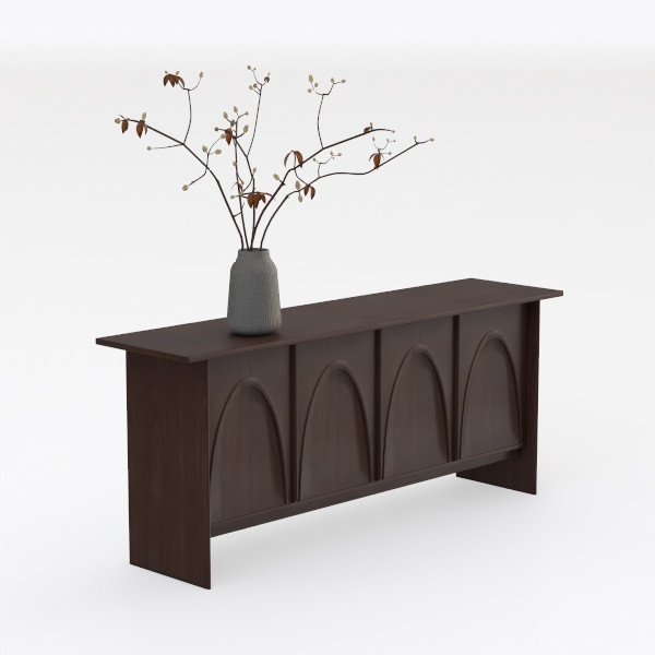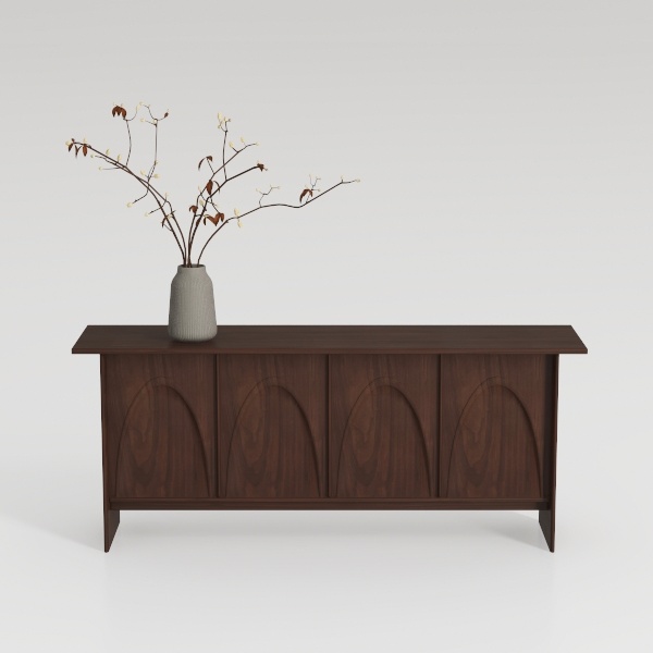 Ideal for spaces embracing a blend of modern minimalism and natural serenity, it shines in a minimalist living room paired with a light-toned sofa and a jute rug, or in a cozy study with a marble-top desk and a small reading lamp. Its four arched cabinet doors not only add a sculptural, almost whimsical softness to the front but also offer practical storage—each compartment is spacious enough for organizing books, decor, or daily essentials, while the low-profile frame and tapering legs keep the design light and stable. A simple arrangement of dried branches or a small potted plant on top ties the piece to its natural roots, making it both a functional storage solution and a thoughtful design statement.