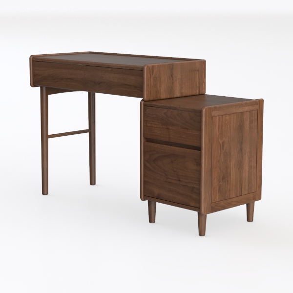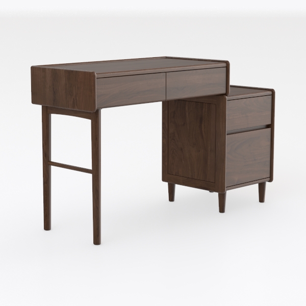 Crafted from deep, honeyed walnut, the surface shimmers softly under light, its natural grain patterns telling a story of the tree’s growth—each curve and swirl a testament to nature’s artistry. The tabletop, smooth and cool to the touch, contrasts gently with the slightly roughened edges of the drawers, inviting fingers to trace the hand-polished finish. The slender, tapering legs, angled at the base, lend a lightness that belies the piece’s sturdiness, while the overall symmetry—spanning the main desk and side cabinet—creates a visually satisfying, balanced presence.