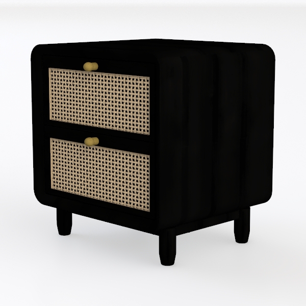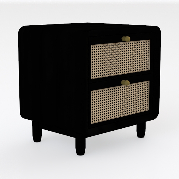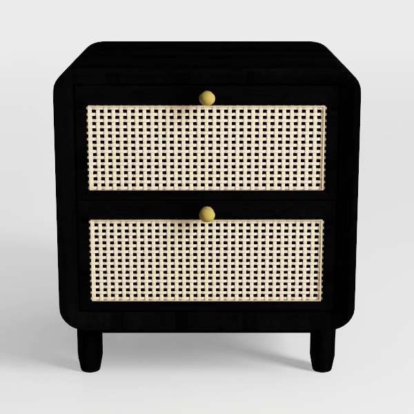 This bedside cabinet merges natural texture with modern minimalism, inspired by the artistry of traditional woven craftsmanship reimagined for contemporary interiors. The deep black frame, crafted from smooth matte-finished wood, offers a grounding, sophisticated base, while the drawer fronts feature a delicate, evenly spaced rattan-like weave—light, airy, and tactile, adding organic warmth to the design.