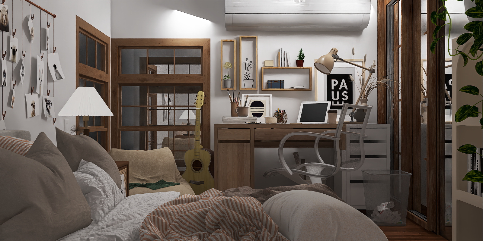 Visually, it strikes a harmonious balance: the clean, angular lines of the silhouette keep it uncluttered, while the woven texture introduces depth, catching light gently to create a soft play of shadows. The smooth surface of the wooden top contrasts with the slight roughness of the woven panel, making the piece feel both sturdy and inviting to the touch. A sleek, cylindrical lamp with a pleated linen shade sits atop, its neutral hue complementing the brown base, while a small, minimalist ceramic vase and a book (its cover subtly contributing to the scene’s calm aesthetic) add functional charm.