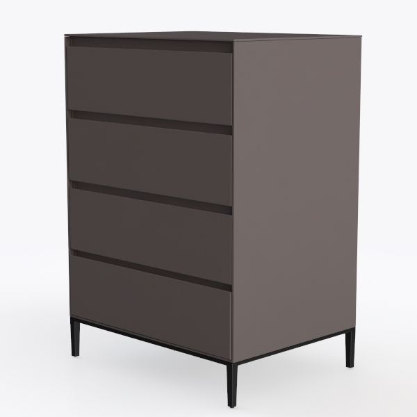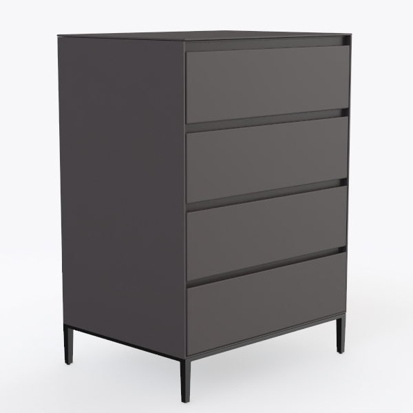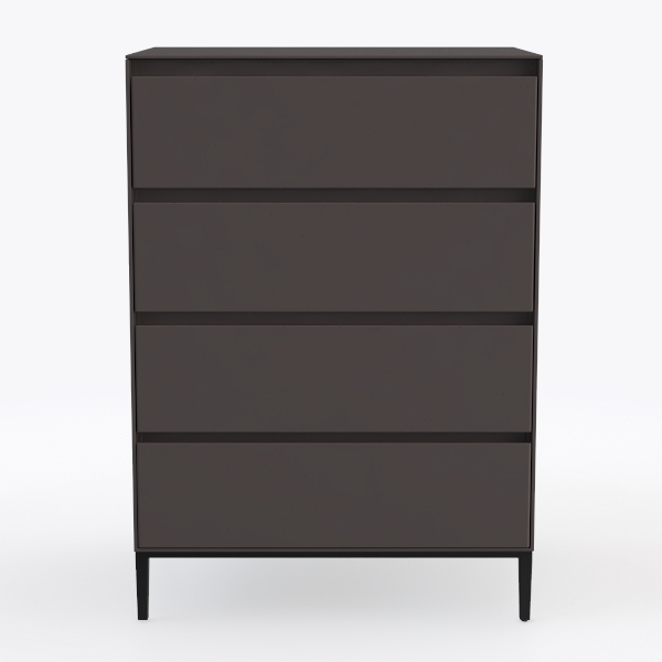 This elegant four-drawer cabinet draws design inspiration from the serene balance of Scandinavian minimalism and industrial restraint, focusing on uncluttered lines and intentional material contrast. Its cabinet surface features a velvety matte finish in a soft charcoal tone, with a subtle, warm undertone that diffuses light gently, avoiding harsh reflections and creating a calm, grounding presence. The slim black metal legs, tapering slightly at the base, add a touch of structural definition, grounding the piece while keeping it visually light and open.