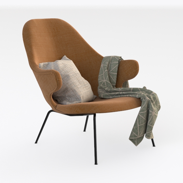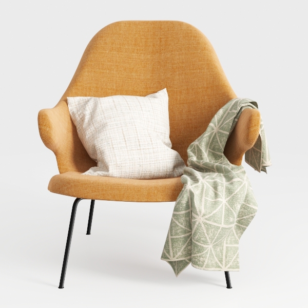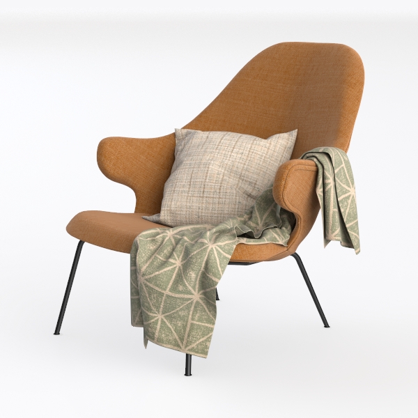 Visually, the chair strikes a balanced harmony: the warm orange tones of the upholstery contrast gently with the cool, matte black metal legs, which slope slightly outward for stability and a touch of mid-century flair. The high, rounded back and wide armrests frame the body comfortably, creating a cocoon-like feel that draws the eye in, while the neutral background emphasizes the chair’s tactile details—from the fabric’s subtle weave to the throw’s soft drape.