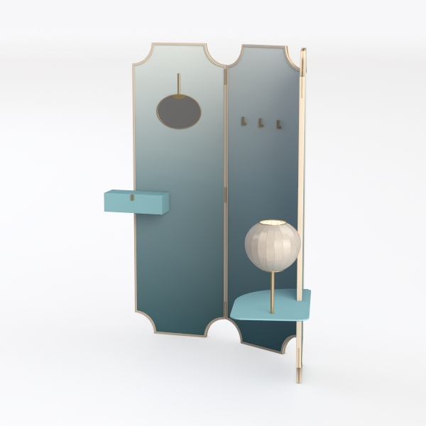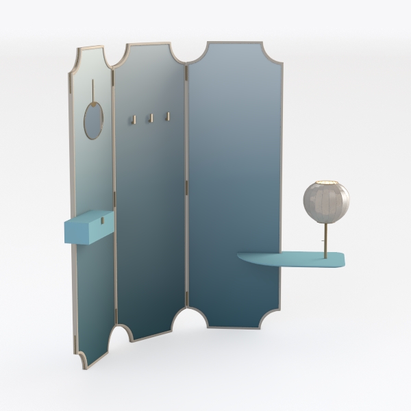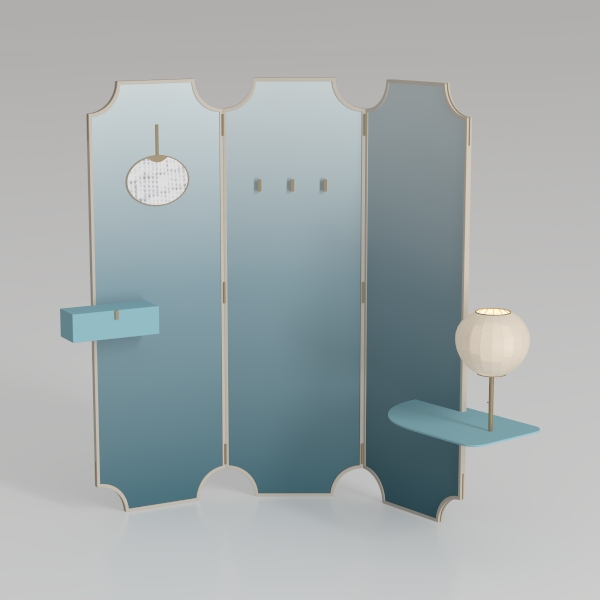 Visually, the screen feels both tranquil and inviting: the light blue hue evokes misty dawns or still waters, while the gold accents add understated luxury. Each panel offers distinct functional zones, ensuring both aesthetic appeal and utility. On the left, a small drawer provides hidden storage for trinkets or stationery; the middle section features three sleek hooks for hanging accessories like scarves or keys. The right panel includes a floating shelf, perfectly sized for displaying small plants, books, or the included spherical paper-lantern lamp, which casts a warm, ambient glow.