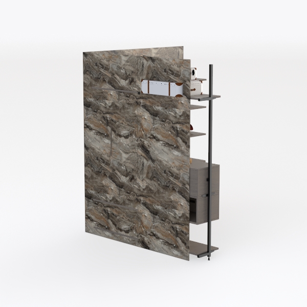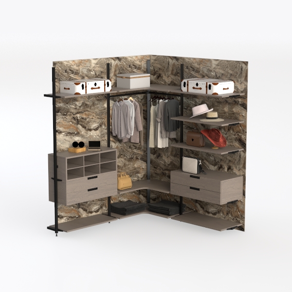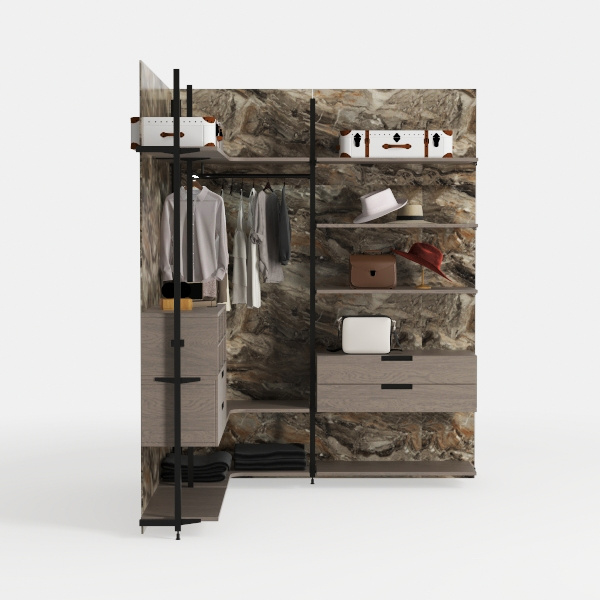 Inspired by the organic texture of natural stone formations and the timeless charm of vintage travel, this modular wardrobe blends earthy elements with sleek, structured design. The backdrop features a warm, weathered stone-like surface, rendered in a tactile material that mimics the rough, uneven grain of natural rock—adding depth and a sense of groundedness to the space. Contrasting this, black metal rods and frames provide sharp, geometric lines, balancing the softness of the stone with a modern, industrial edge, while the wooden shelves and drawers, finished in a muted taupe, offer a warm, inviting counterpoint, their smooth surfaces inviting gentle touches.