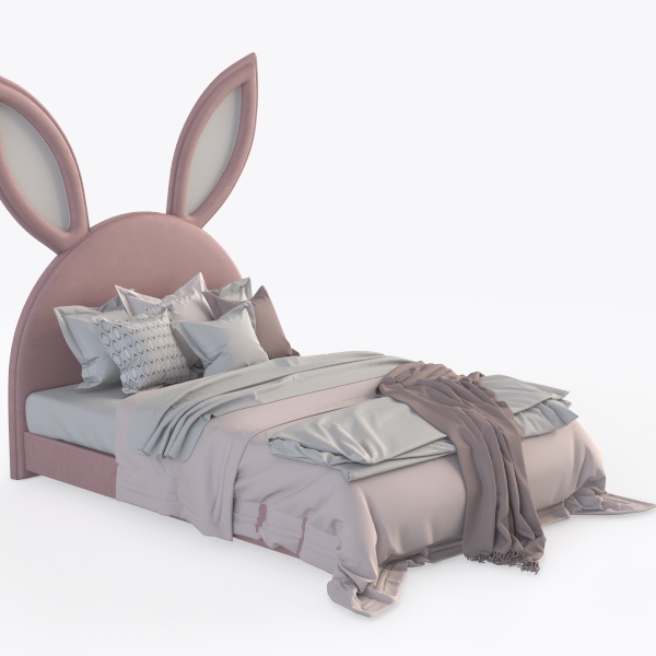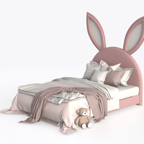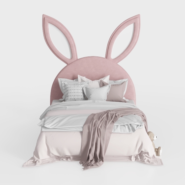 This charming bed design draws inspiration from playful childhood imagery, with its headboard shaped like the ears of a rabbit, adding a whimsical touch to any space. Crafted with soft, plush fabric in a gentle blush pink, it feels incredibly smooth against skin, creating an inviting and warm visual presence. The bed’s overall aesthetic is defined by its light, airy palette—soft white and pale pink linens, paired with a textured throw in muted taupe—blending to evoke calmness and comfort.
