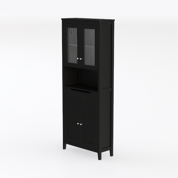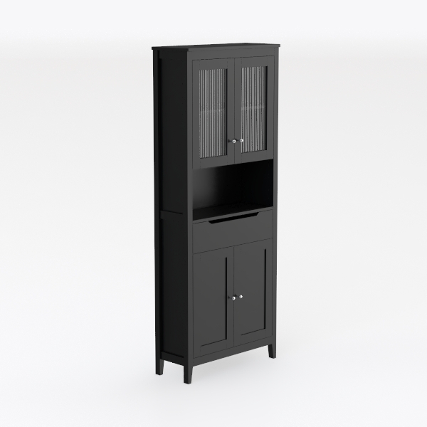 Crafted with a focus on minimalist functionality, this cabinet draws inspiration from the "less is more" design philosophy, balancing clean lines and practical space utilization to enhance modern living. Its matte black finish features a smooth, cool-to-touch surface, with a subtle texture that catches light softly, avoiding harsh reflections and adding depth to its sleek silhouette. The upper section, framed by frosted glass doors with vertical ribbing, allows light to filter through while keeping displayed items—think vintage mugs or small plants—discreetly showcased, while the middle open shelf offers quick access to frequently used objects, blending visibility with convenience.