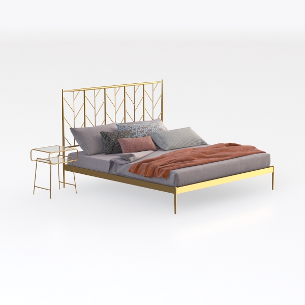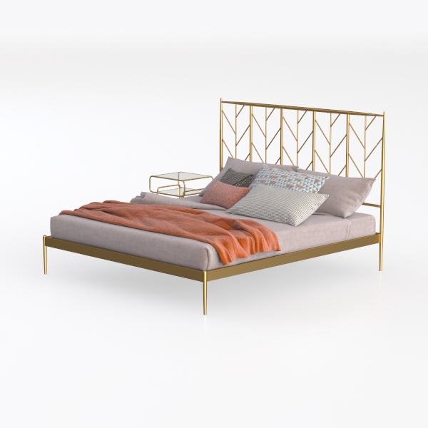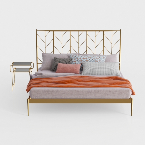 This elegant bed design draws inspiration from nature, with its headboard featuring intricate geometric cutouts that mimic the delicate branching patterns of tree limbs, infusing the space with a sense of organic lightness. The frame, crafted from polished gold metal, shimmers softly, catching light to add subtle glamour, while the bed base is upholstered in smooth, light gray linen—soft to the touch and offering a gentle contrast to the metallic elements. A vibrant orange throw blanket draped casually over the mattress adds warmth, balancing the cool tones and creating visual interest.