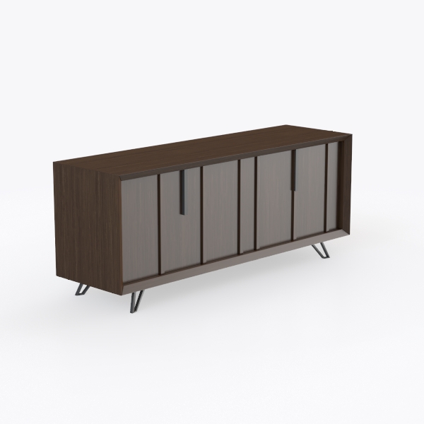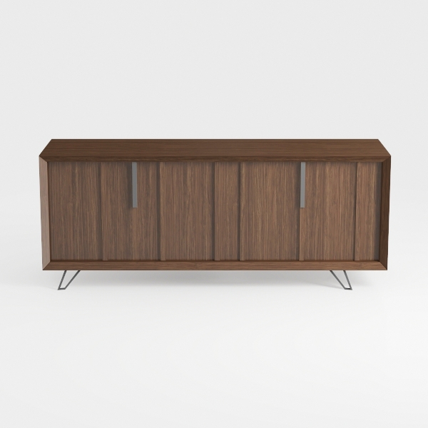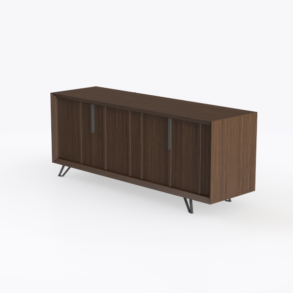 The piece presents a long, rectangular silhouette, its surface wrapped in a warm walnut finish that reveals subtle, flowing wood grain—softly catching light to infuse the space with organic warmth. Inspired by mid-century modern design, it merges geometric precision with natural elements: clean, flat-panel doors glide smoothly on soft-close hinges, minimizing noise and enhancing usability, while a slim, polished top adds a subtle display surface. Supported by sleek, black metal legs that taper gently at the base, the cabinet feels lightweight yet stable, elevating the structure to create an airy, uncluttered look.