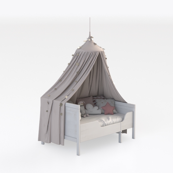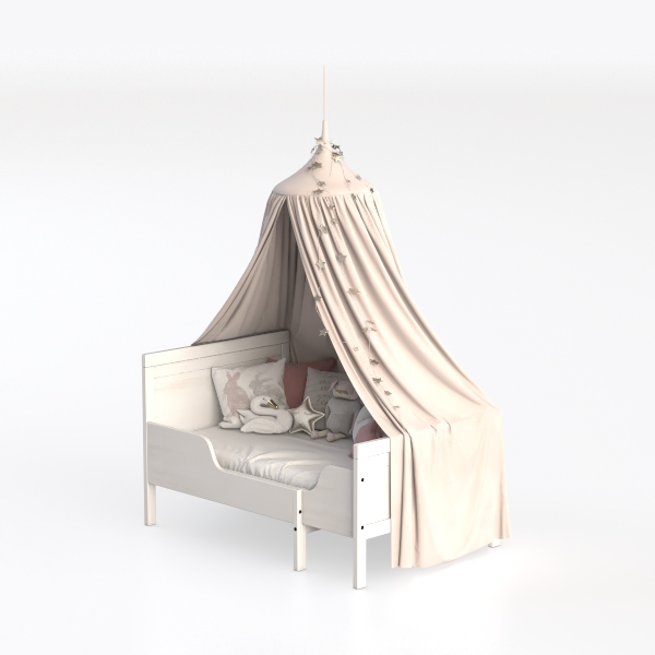 Designed to evoke the magic of bedtime stories, this piece draws inspiration from celestial dreams and enchanted childhood memories. Crafted with a sleek white wooden frame, its surface smooth and polished to a warm luster, the bed radiates a clean, timeless charm. The soft beige canopy, gently draped over the frame, features tiny star-shaped details that catch light subtly, adding a touch of whimsy to the overall look. Below, plush, light-colored bedding—including soft pink and white pillows, a cloud-shaped cushion, and a swan-shaped toy—invites gentle touches and cozy moments, with textures ranging from smooth cotton to fluffy fabrics that feel inviting to the touch.