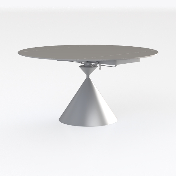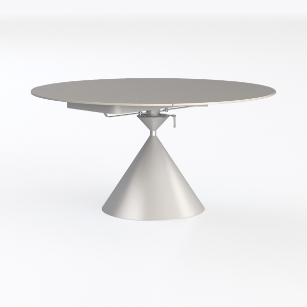 The tabletop features a smooth, polished white surface that reflects light softly, giving it an airy, uncluttered look. Running a hand over it reveals a cool, silky texture, while the base—crafted from sleek metallic silver—boasts a tapering cone shape that adds subtle visual interest. The seamless transition from the circular top to the conical base enhances the piece’s sense of lightness, avoiding the bulk often associated with larger furniture.