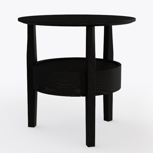 Inspired by Scandinavian design philosophy, this piece embodies the essence of minimalist elegance with a focus on practicality. Its sleek, matte black surface features delicate wood grain patterns that emerge subtly under the smooth finish, creating a tactile contrast—cool to the touch yet warm in its organic depth. The circular tabletop sits gracefully above a lower, curved shelf, supported by slender, tapering legs that lend a light, airy feel, ensuring it doesn’t overwhelm even the coziest of spaces.