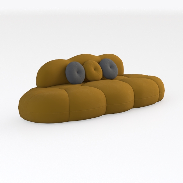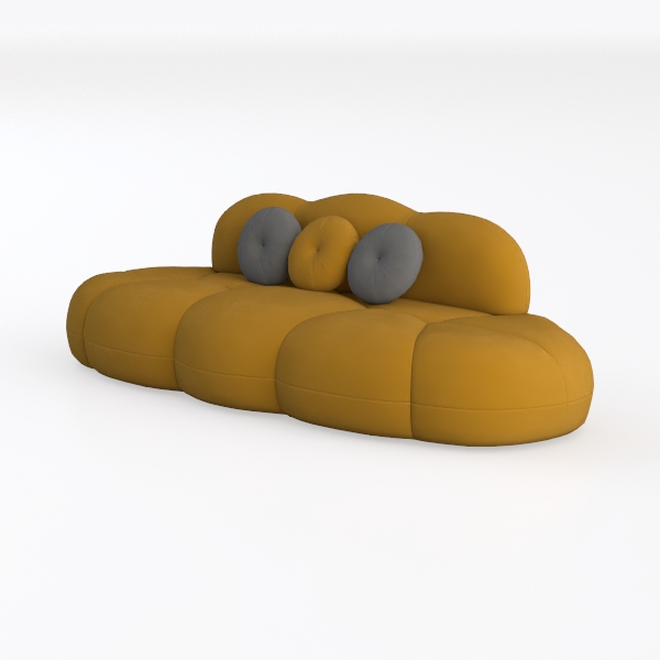 Introducing a stunning sofa that combines playful design with remarkable comfort. Drawing inspiration from organic shapes, this piece features soft, rounded forms that invite relaxation and create a cozy atmosphere. The vibrant mustard upholstery exudes warmth and cheer, while the contrasting gray throw pillows add a touch of sophistication, enhancing the overall visual appeal.