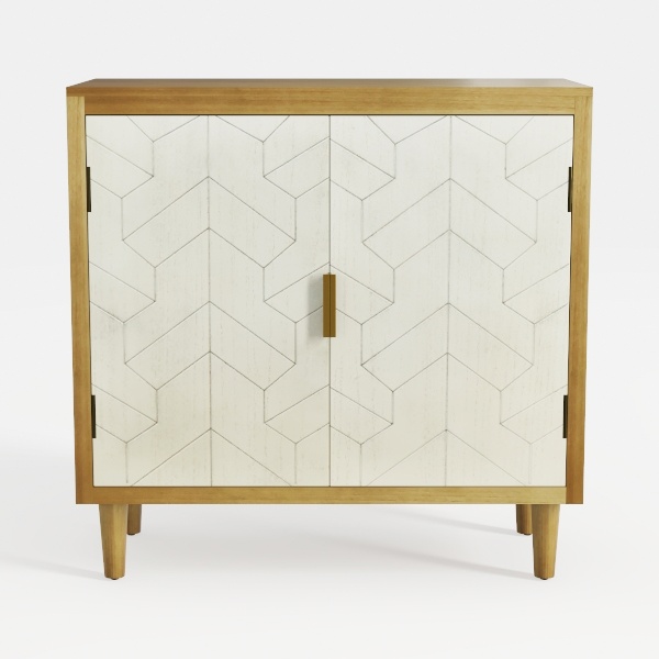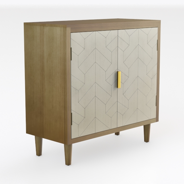 The warm, honey-hued wood frame features subtle grain textures, offering a tactile contrast to the smooth, matte white paneling. Crisp, black geometric lines form a repeating herringbone-inspired pattern across the front, where each line and angle aligns precisely, creating a rhythmic, eye-catching rhythm without overwhelming the space. The gold-toned, rectangular handle acts as a subtle focal point, balancing the softness of the white and wood.