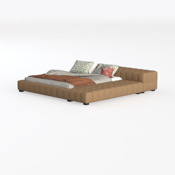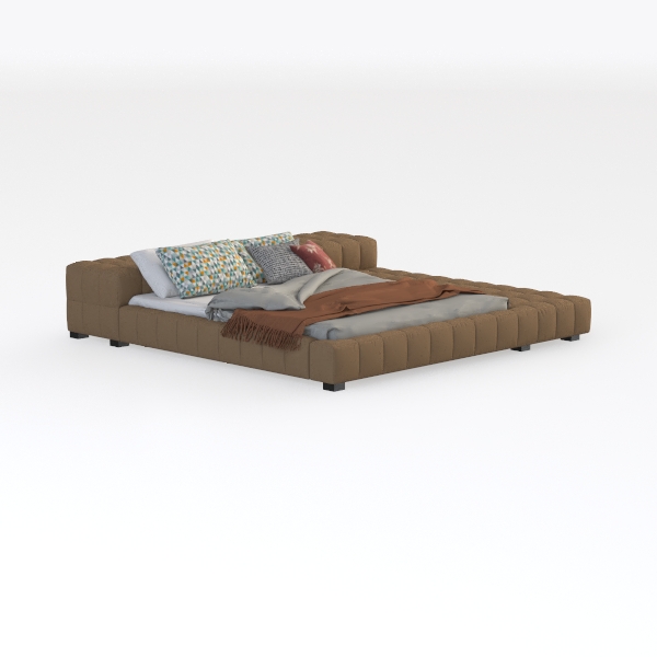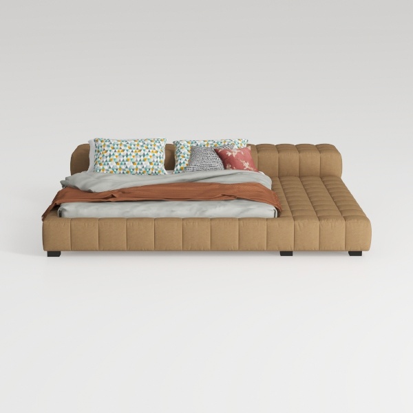 The upholstery in a rich, warm brown hue feels remarkably soft to the touch, with subtle tufting along the headboard and footboard adding gentle texture without overwhelming the clean lines. This combination of smooth fabric and defined stitching creates a visually grounding presence, while the generous proportions—spacious enough for two but never bulky—make it feel airy and uncluttered, despite its substantial size.