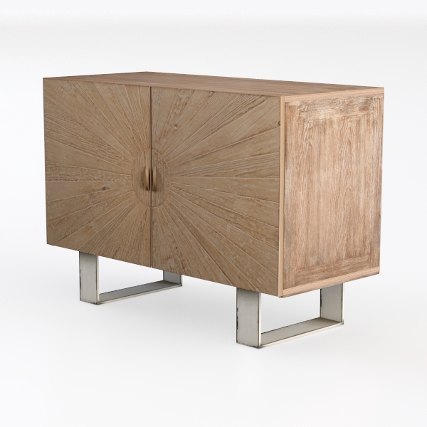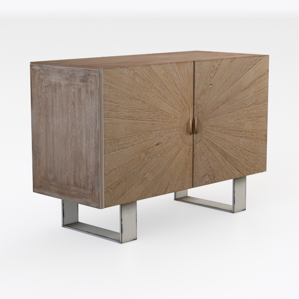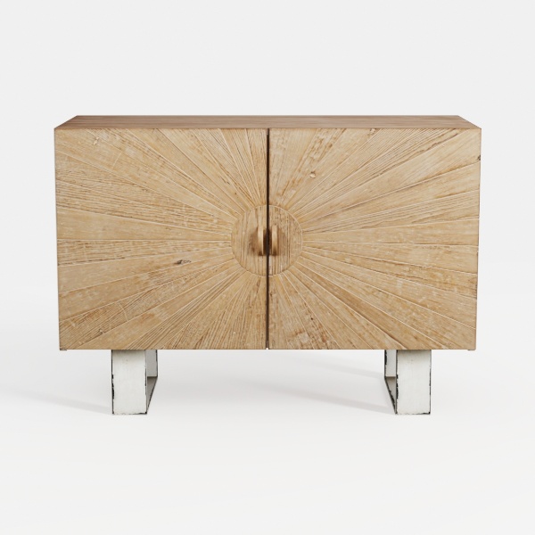 This cabinet draws inspiration from the organic radiance of sunburst motifs, evoking the soft glow of sunlight filtering through leaves. Its surface features intricate, hand-carved radiating lines that create a dynamic, textural depth—each groove highlighting the natural grain of the light-toned wood, offering a warm, tactile contrast between smooth and slightly raised patterns. The weathered finish adds a vintage charm, making the piece feel both artisanal and approachable. Visual balance is achieved with crisp white, angular legs that elevate the design, keeping it light and unobtrusive against any backdrop.