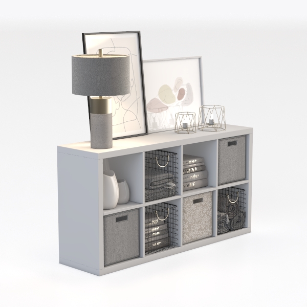 Visually, its sleek, matte white frame reflects light to create an airy, spacious feel, while the mix of textures adds depth—soft gray fabric bins with a subtle weave offer a gentle touch, smooth metal wire baskets introduce a cool, structured contrast, and the crisp surfaces of stacked books and framed art enhance clarity. The neutral color palette, accented by warm grays and minimalist metallic touches (think the lamp’s gold base and wire elements), evokes a sense of calm modern serenity, making the space feel both open and intentional.
