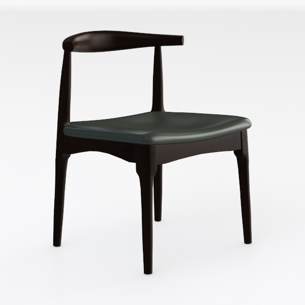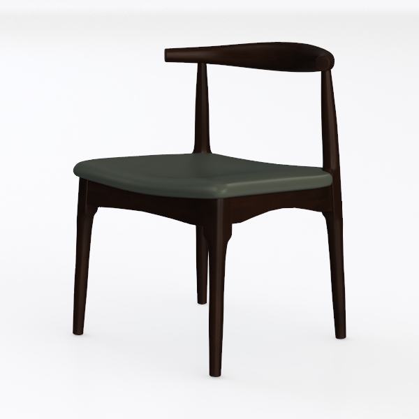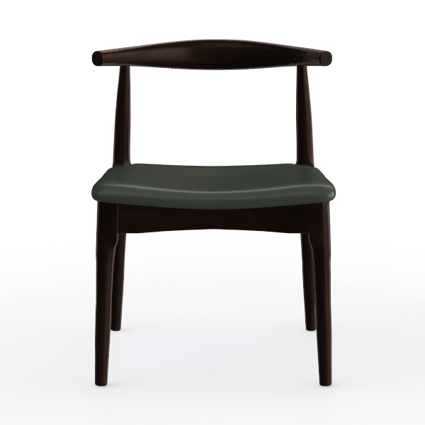 This chair draws inspiration from mid-century Scandinavian design, blending organic simplicity with geometric balance. Its dark-stained wooden frame features a warm, rich grain that catches light softly, while the gently curved backrest, sweeping from the top of the angled armrests to the base, follows the natural curve of the spine—offering subtle yet effective support. The seat, upholstered in a smooth, cool sage-green leather, contrasts beautifully with the wood, creating a tactile harmony between the warmth of the material and the sleekness of the finish.