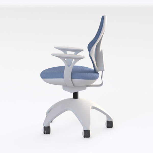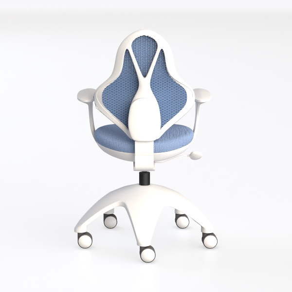 Visually, the chair feels refreshing and uncluttered. The breathable mesh back, paired with a soft sky-blue upholstered seat, offers a cool, airy contrast to the crisp white frame, enhancing the overall sense of calm. The smooth, rounded edges and balanced proportions make it a visually cohesive piece, whether viewed from the front or side, with no sharp angles to disrupt its modern appeal.