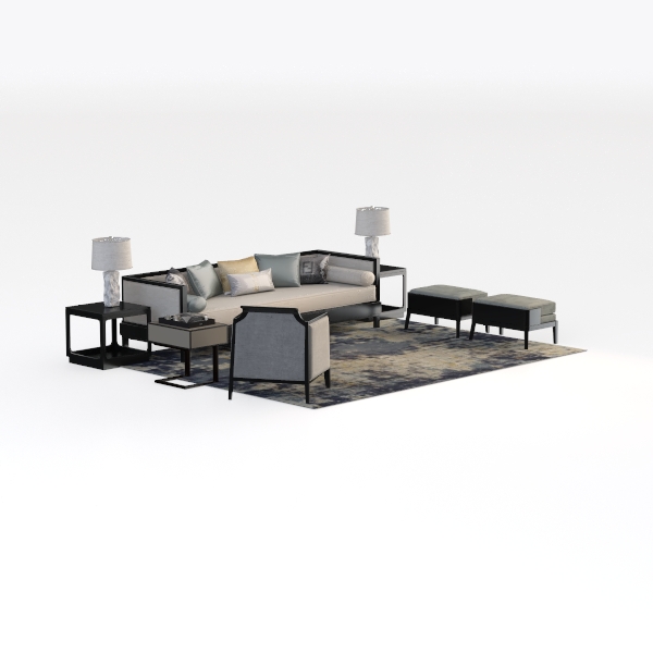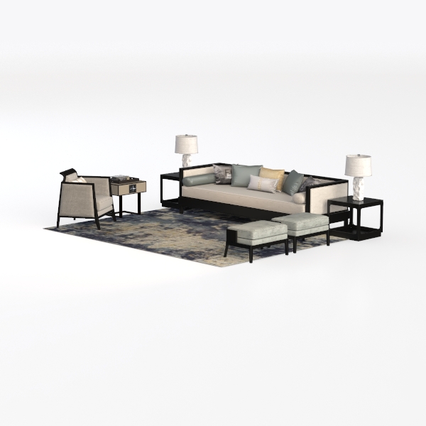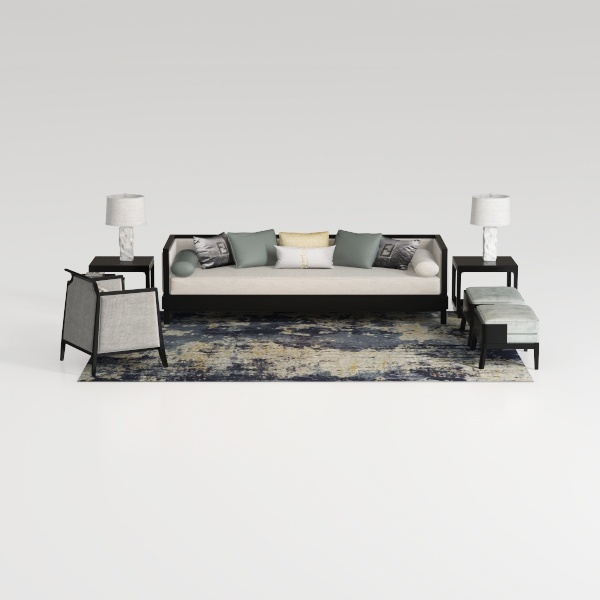 Designed to embody modern minimalist elegance, this living room ensemble draws inspiration from the clean lines of contemporary architecture and the organic flow of natural textures, balancing structural simplicity with warm, tactile comfort. The sofa features a soft, neutral upholstery—plush yet breathable—inviting long moments of relaxation, while the mix of throw pillows adds layers of visual interest: some with a smooth linen finish, others with subtle velvet or bouclé textures, in muted tones of sage, cream, and charcoal, complementing the deep, moody pattern of the area rug beneath.