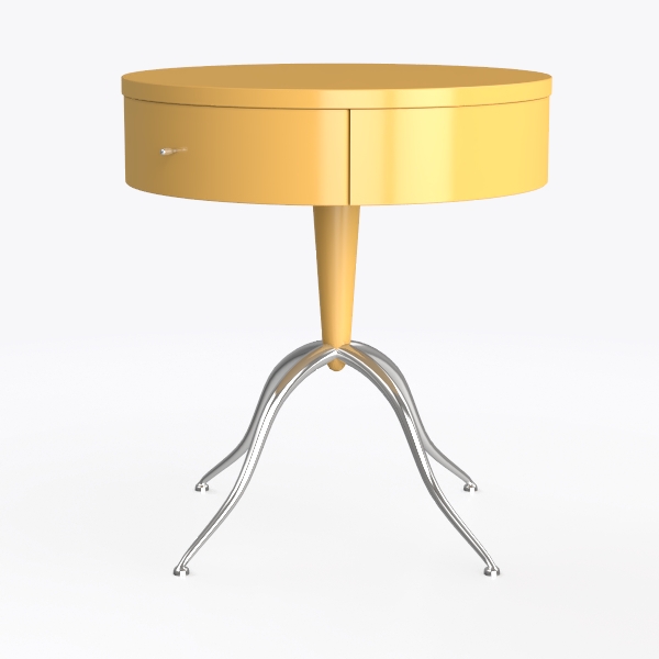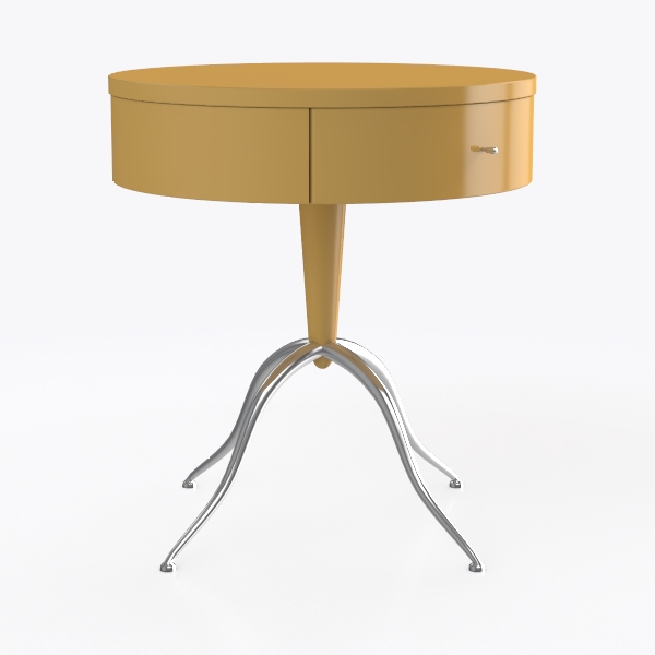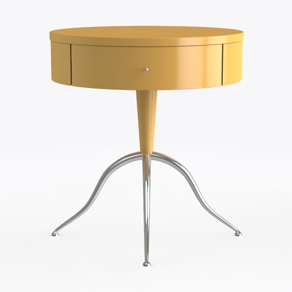 Ideal for a bedroom setting, it pairs seamlessly with a low-profile wooden bed frame, a linen-upholstered headboard, and a vintage-inspired desk lamp with a marble base, enhancing both minimalist and eclectic decor. The single, subtly inset drawer with a small, chrome knob provides practical storage for bedtime essentials like reading glasses or a phone, while the open space beneath the top is perfect for a small potted plant or a sculptural vase. Its compact footprint ensures it fits even in cozy bedrooms, while the combination of warm wood tones and sleek metal adds depth and visual interest to the space.