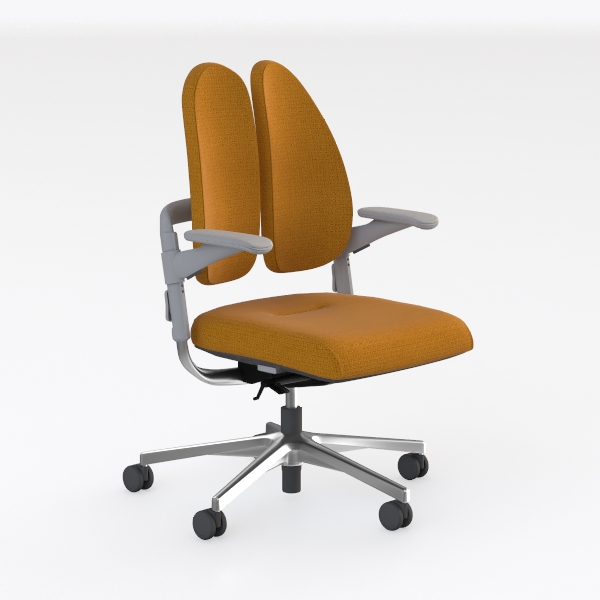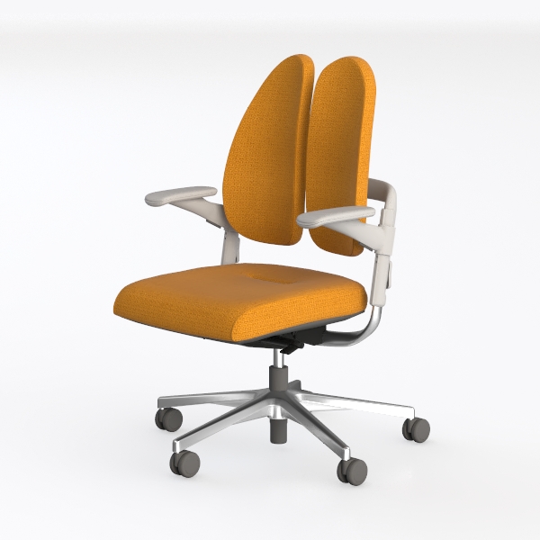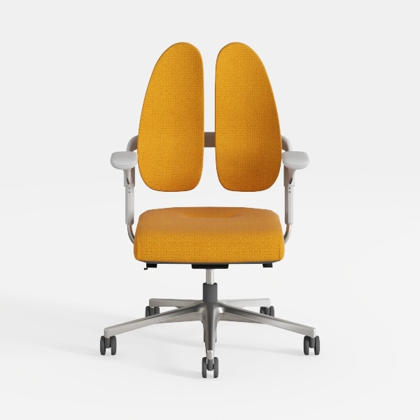 This contemporary office chair merges thoughtful ergonomic design with understated elegance, making it a standout piece for modern living and workspaces. Its design philosophy centers on human-centric comfort, inspired by the natural curve of the spine—two integrated backrests gently cradle the upper and lower back, aligning posture and reducing strain during extended use. The chair’s vibrant amber upholstery, crafted from a textured, breathable fabric, offers a soft, pillowy feel that invites relaxation, while the matte white armrests provide a crisp, cool contrast, balancing warmth and modernity. The silver-finished metal frame, with its angular, lightweight legs and smooth-rolling casters, adds a sleek, industrial edge, ensuring stability without bulk.