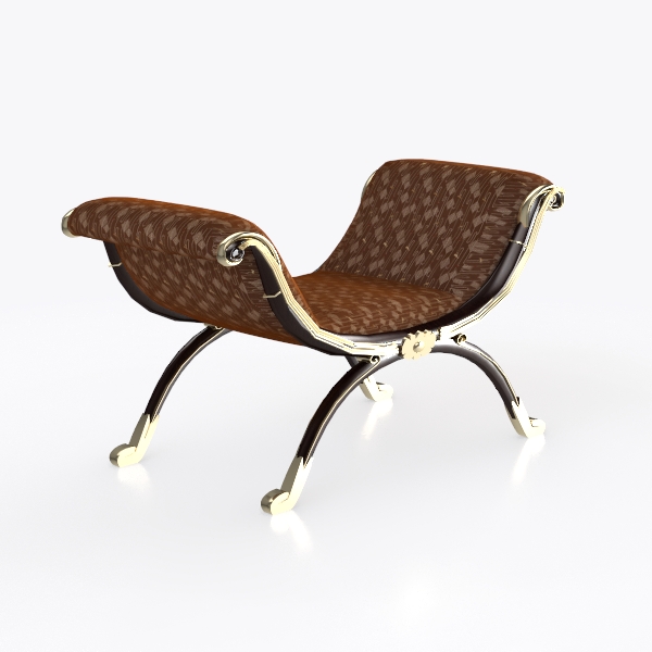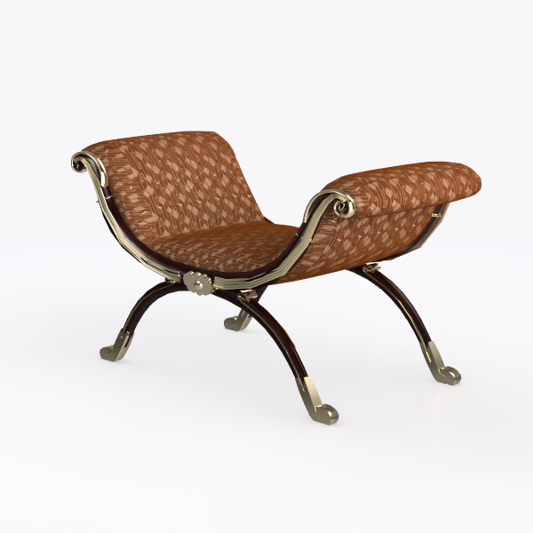 Inspired by the organic curves of seashells and the soft lines of 18th-century upholstery, this piece merges timeless elegance with modern versatility. The seat, draped in a warm orange fabric with a subtle, repeating geometric pattern, feels plush and inviting to the touch, while the gently curved armrests mirror the fluidity of its design. The black and gold metal frame, with its polished finish and intricate X-shaped legs, adds a touch of refined opulence—its sleek, angular structure balancing the softness of the upholstery.