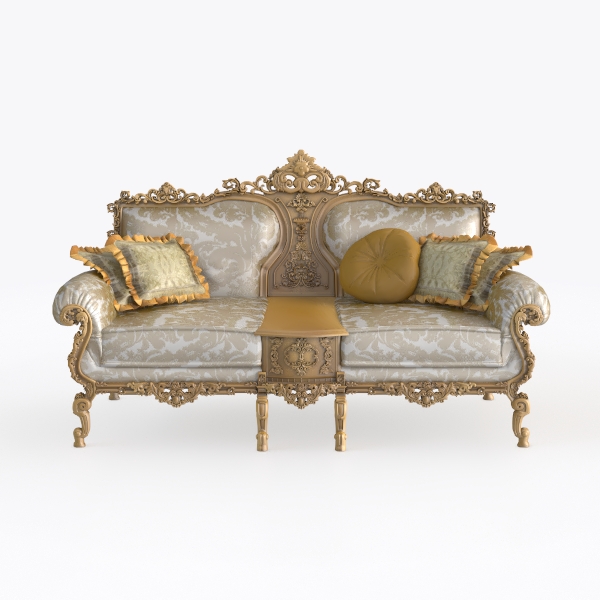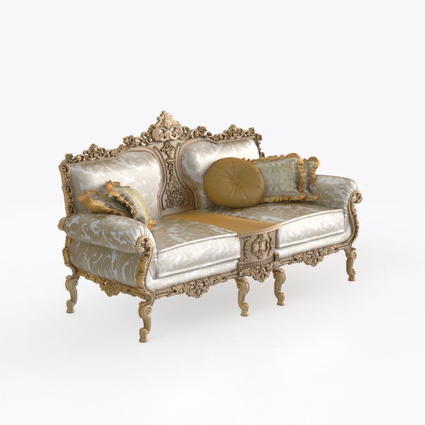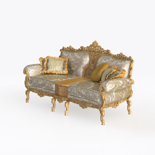 Evoking the timeless allure of 18th-century European craftsmanship, this sofa weaves intricate artistry with everyday comfort. Its frame, adorned with delicate gold-carved scrollwork, shimmers softly under light, while the upholstery—woven in a warm cream hue with subtle floral patterns—feels luxuriously plush to the touch. Plush, gold-fringed cushions add a layer of texture, and a polished wooden table between the seats blends practicality with elegance, perfect for resting a cup of tea or a stack of novels. The deep, generous seat invites relaxation, making it ideal for both quiet evenings and lively gatherings. This piece would be a crown jewel in a grand living room, harmonizing with dark wooden floors, crystal chandeliers, and antique side tables to infuse the space with classic opulence.