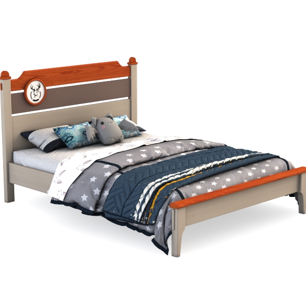 Inspired by nature and woodland elements, this bed features a warm wooden headboard with a circular deer motif. The smooth, polished wood contrasts gently with the soft beige frame, creating a cozy, playful vibe. Perfect for a kids' room, it pairs beautifully with star-patterned bedding and plush toys, enhancing a nature-themed or Scandinavian-inspired space. Sturdy construction ensures stability, while the inviting design promises a restful sleep for little ones.