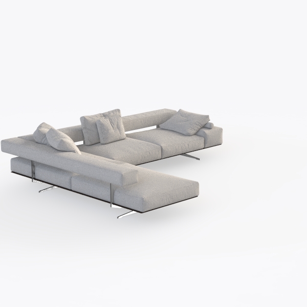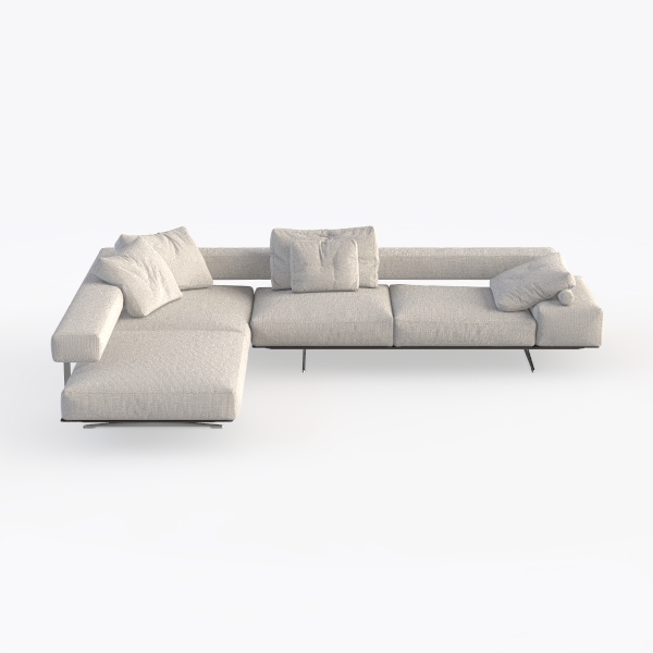 This L-shaped sofa embodies a harmonious blend of minimalist design and cozy functionality, drawing inspiration from the clean lines of Scandinavian aesthetics and the quiet warmth of natural materials. Its soft, light gray upholstery features a subtle textured weave that catches light gently, enhancing its tactile appeal—cool to the touch yet surprisingly warm, like a well-worn linen that invites relaxation. The sofa’s frame, supported by slender black metal legs, gives it an airy, weightless feel, balancing the bulk of its generous size with a sense of lightness.