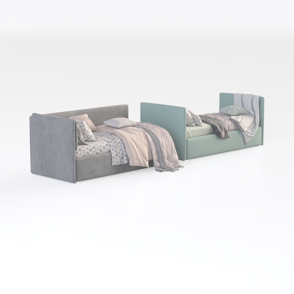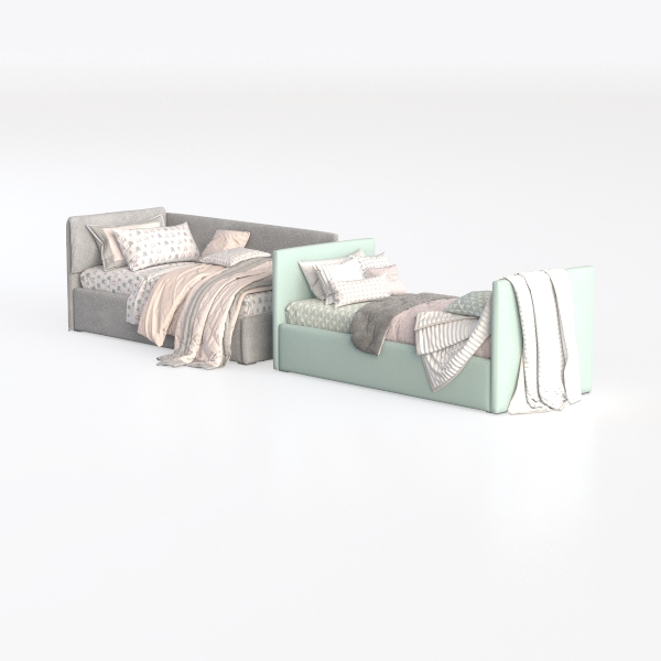 Drawing inspiration from soft natural tones and minimalist Scandinavian design, these beds feature plush, velvety headboards in muted gray and mint, with smooth, light-toned frames that enhance an airy, calm vibe. Perfect for a cozy, modern bedroom, they pair beautifully with linen sheets and wooden nightstands. The low-profile design and ample headroom ensure both style and practical comfort, ideal for restful nights.