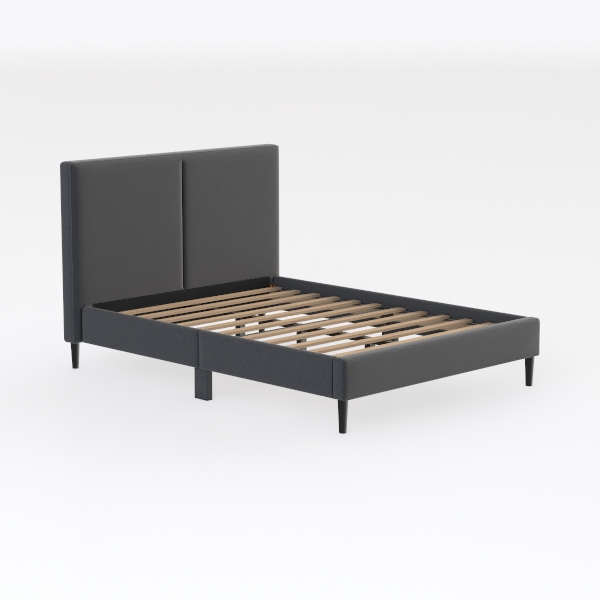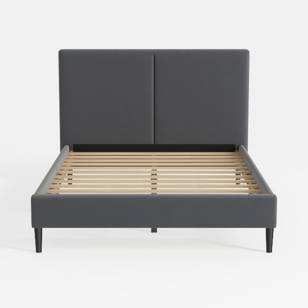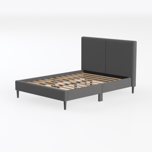 Designed with minimalist aesthetics, drawing inspiration from clean lines and natural textures. The soft, textured gray upholstery warms the space, while sleek tapered legs add lightness. Perfect for modern serene bedrooms, pairing with wooden nightstands and understated lights. Sturdy slat support ensures stability, and the generous headboard offers ideal backrest for reading or relaxing.