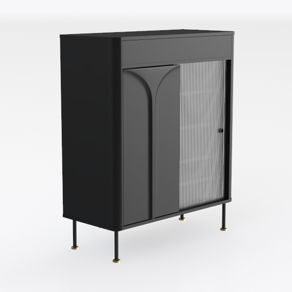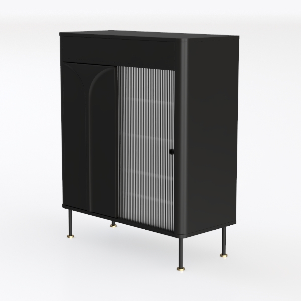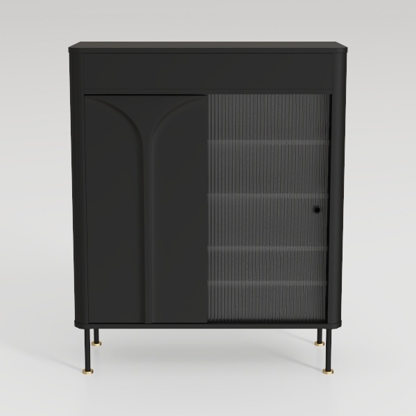 Inspired by mid-century modern charm merged with contemporary minimalism, this cabinet blends classic lines with sleek simplicity. Its matte black solid door offers a smooth, cool touch, while the textured frosted glass door reveals inner shelves softly, balancing opacity and light. Perfect for modern-luxe living rooms or dining nooks, pair it with marble side tables and gold-accented lighting for an elegant, cohesive look. The slender gold metal legs keep it lightweight and easy to clean, with internal tiers providing both hidden storage and displayed decor space.
