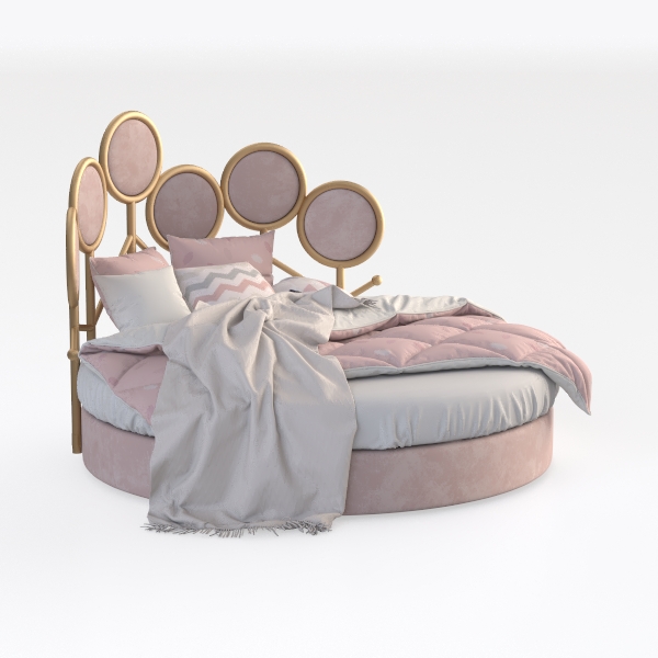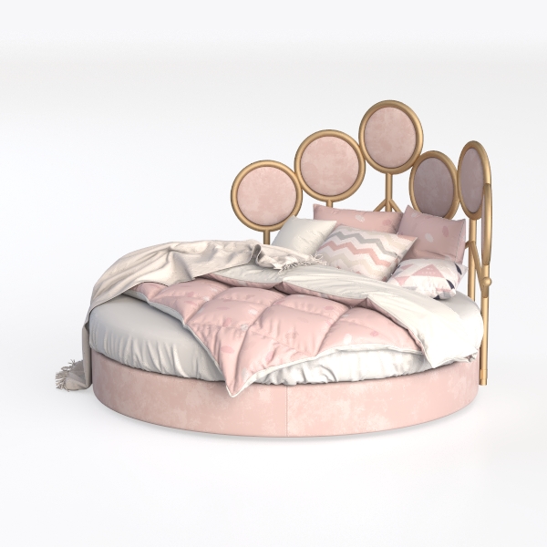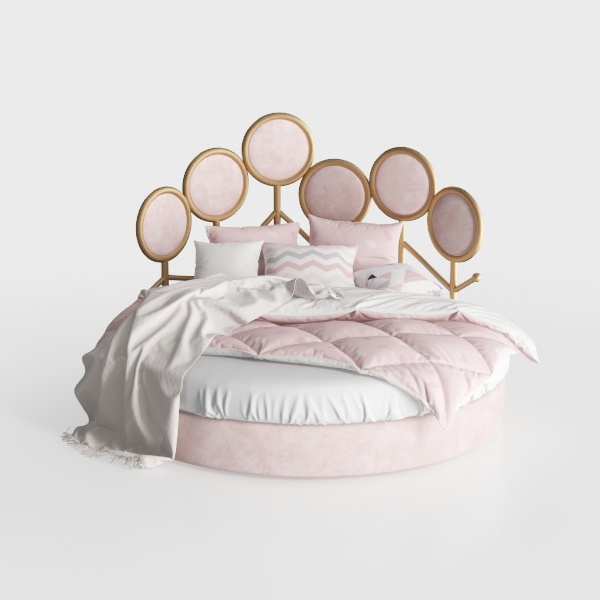 Inspired by blooming floral forms, its golden metal headboard with soft pink circular panels blends vintage charm and modern grace. The smooth, warm-toned upholstery feels luxurious to the touch, while the circular silhouette adds a playful yet elegant visual rhythm. Perfect for a modern romantic bedroom, pair it with marble nightstands and light linen for a serene vibe. A generous diameter ensures comfortable movement and relaxation, ideal for unwinding after a long day.