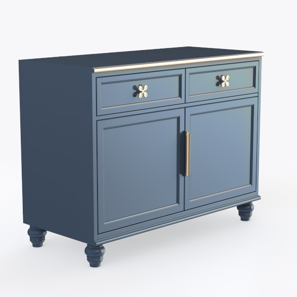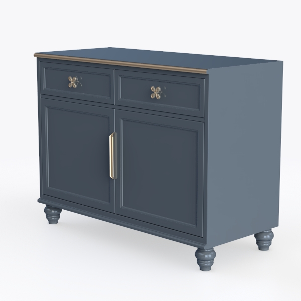 Inspired by classic craftsmanship with soft blue tones, this cabinet features smooth, matte surfaces and polished brass hardware, blending vintage charm with modern elegance. Its clean lines and curved legs add lightness, perfect for living rooms or dining spaces, offering ample storage through two drawers and double doors.