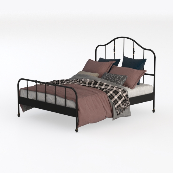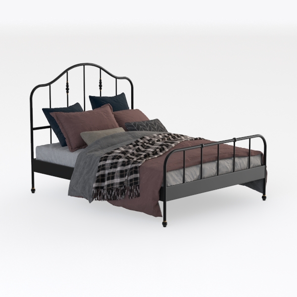 Inspired by industrial vintage design, this bed blends sleek metalwork with warm, inviting textures. The matte black frame contrasts beautifully with soft pink linen, while dark blue and geometric-patterned pillows add depth. A checkered throw draped casually enhances coziness. Perfect for a retro-industrial or modern minimalist bedroom, pair it with wooden nightstands and vintage wall art. Sturdy construction ensures durability, and the low-profile frame offers easy access to under-bed storage.