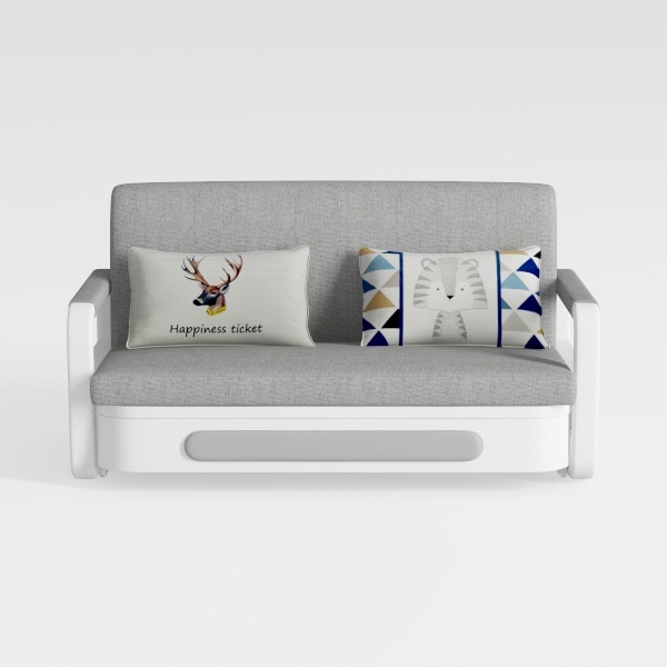 The seat, draped in a soft, light-grey fabric, invites relaxation with its supple texture, as if crafted from a premium linen blend that offers a satisfyingly plush yet breathable feel. The contrasting white armrests, smooth and slightly rounded, add a crisp, contemporary edge, while the overall silhouette remains uncluttered, letting the decorative pillows take center stage. One features a whimsical deer illustration paired with the phrase “Happiness ticket,” the other a playful geometric pattern with a cat motif—each infusing the design with personality without sacrificing its calm, cohesive vibe.