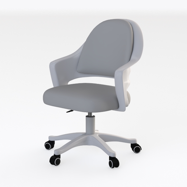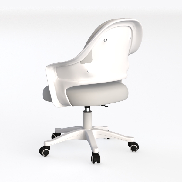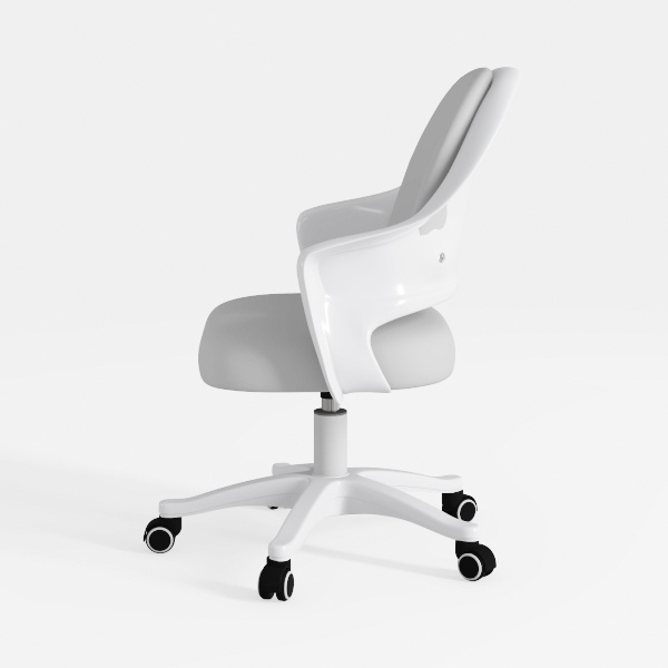 Inspired by minimalist ergonomics, this chair features a sleek, white frame with a smooth, matte finish, contrasting beautifully with its soft, gray padded seat. Its contoured backrest and gently curved armrests ensure all-day comfort, while the swivel base with smooth-rolling casters allows effortless movement. Perfect for a modern home office or minimalist living room, it pairs well with wooden desks and neutral decor, blending functionality with understated elegance.