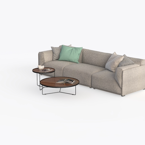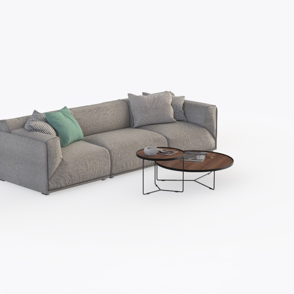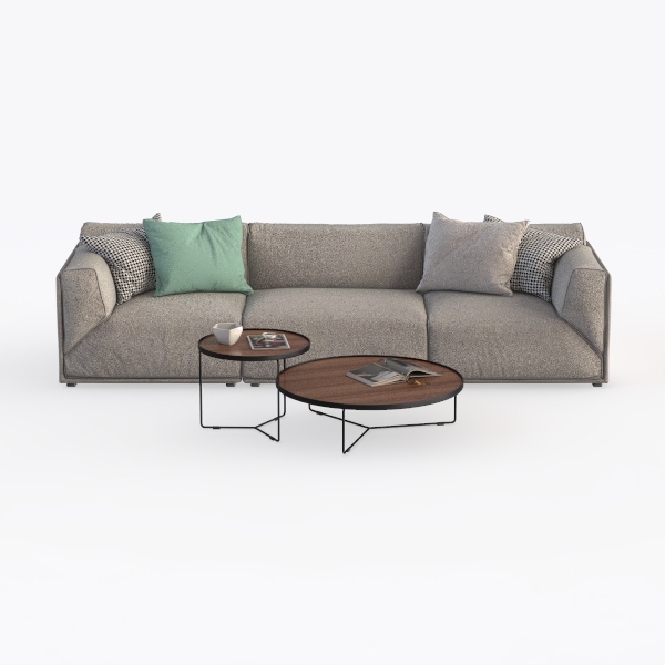 Beyond its looks, the sofa’s generous seat depth and loose back cushions offer exceptional comfort, encouraging relaxation after a long day. The two-tiered coffee tables—with a taller, main table and a smaller, nested one—provide flexible surface space: use the larger for books or a centerpiece, the smaller for mugs or remotes, ensuring the area stays organized and inviting.