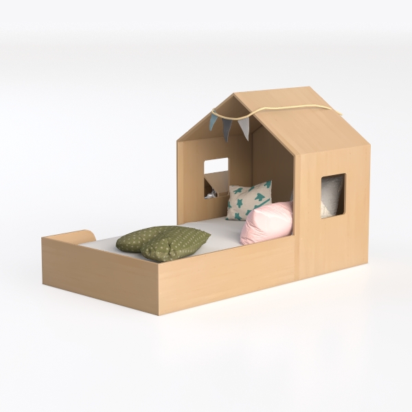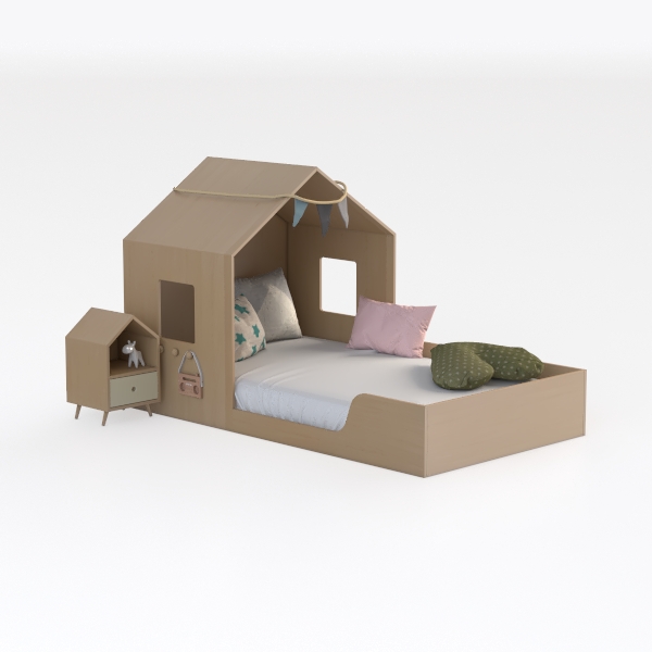 Designed to evoke a cozy forest retreat, this wooden bed features a charming house-shaped headboard with soft, warm tones. Warm oak finish and smooth surfaces create a gentle, inviting touch, while curved edges add a playful, safe vibe. Light, airy, and adorned with pastel pillows, it blends rustic charm with child-friendly brightness. Ideal for minimalist Scandinavian kids' rooms, pair with a matching wooden nightstand and soft rugs for a cohesive, magical space. Ample space for pillows and toys ensures comfort, with compact design saving room in small bedrooms.