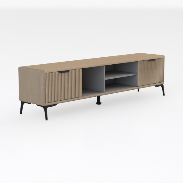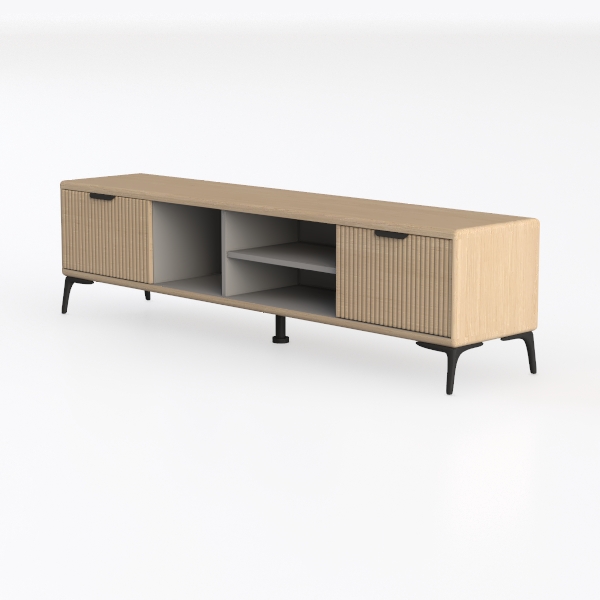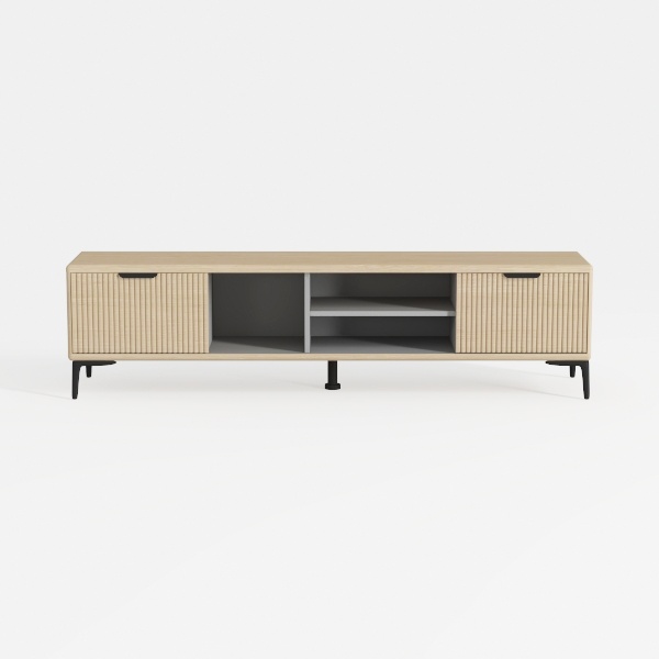 Inspired by natural woven textures, this cabinet blends warmth and organic charm. Light wood grain with vertical stripes creates smooth, tactile surfaces, while matte finish adds understated elegance. Perfect for modern minimal or Scandinavian living rooms, ideal with neutral sofas, potted plants, and soft lighting. Spacious storage with closed cabinets and open shelves organizes media, and slim black legs keep it lightweight and uncluttered.