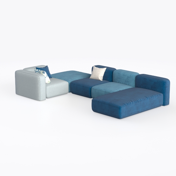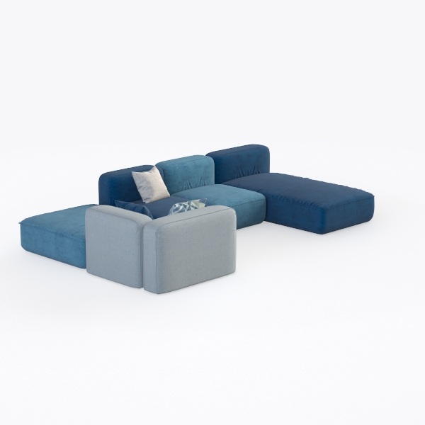 This sofa ensemble draws inspiration from the fluidity of coastal landscapes and the need for adaptable living spaces, blending soft curves with modular versatility. Its upholstery features a gradient of rich teal and sky-blue fabrics, each with a subtle, velvety texture that invites touch—cool to the hand yet warm in presence. The interplay of light and shadow across its gently sloped arms and deep seat cushions creates a sense of depth, while a neutral-toned lumbar pillow adds a soft contrast, grounding the look without overwhelming it.