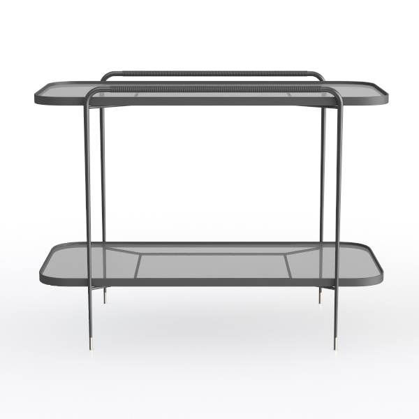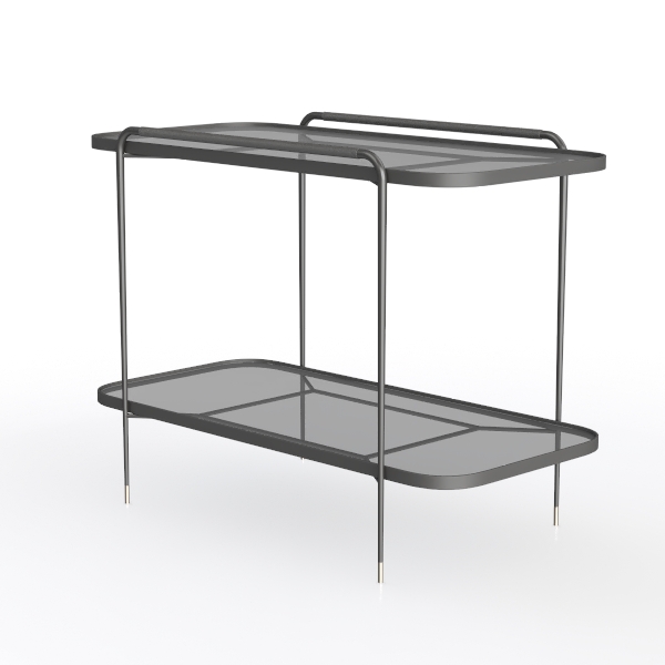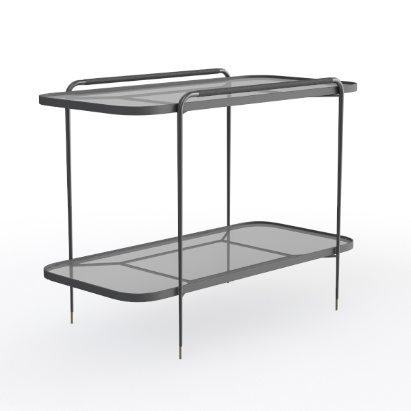 Drawing inspiration from mid-century modern minimalism, its sleek silhouette blends geometric precision with lightweight elegance. The matte black metal frame, with subtle gold-tone accents, contrasts sharply with clear glass shelves, creating a cool yet warm visual rhythm; thin, tapering legs add lightness, balancing sturdiness and airiness. Ideal for modern living rooms (with plush sofas/ sculptural lamps) or minimalist bedrooms as a nightstand. Two-tiered design offers ample space for decor, books, or drinks, fitting small corners seamlessly.