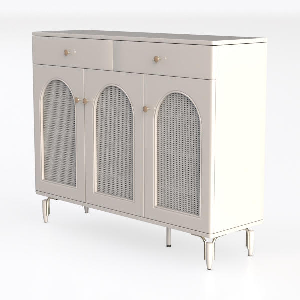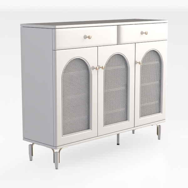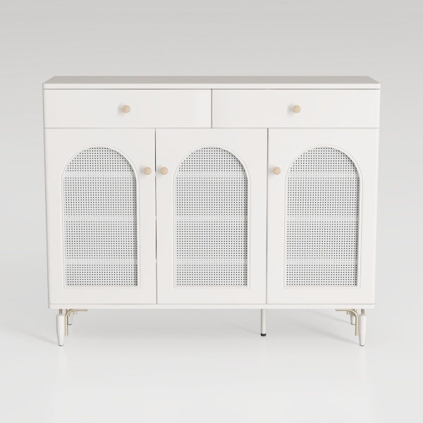 Inspired by natural textures and mid-century charm, this white cabinet features intricate rattan detailing on three doors, complemented by warm gold knobs and slender legs. Its clean finish and woven pattern create a bright, airy look, ideal for modern minimalist or Scandinavian spaces, offering ample storage with a touch of timeless elegance.