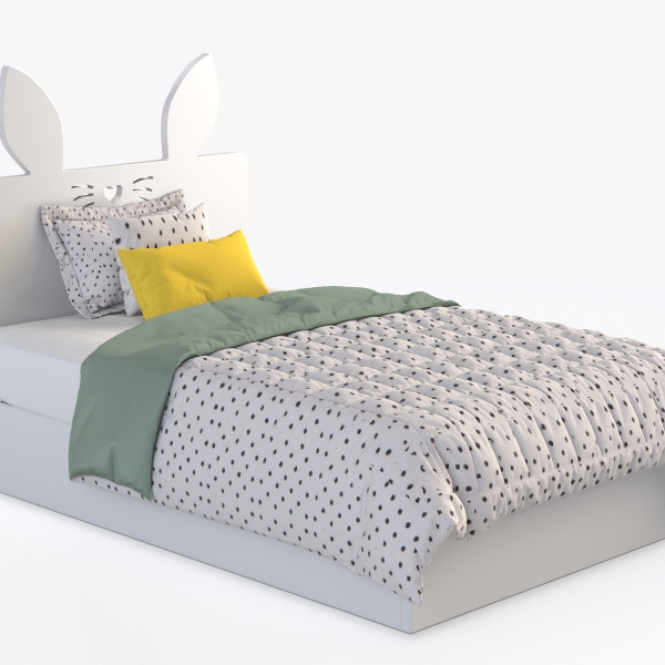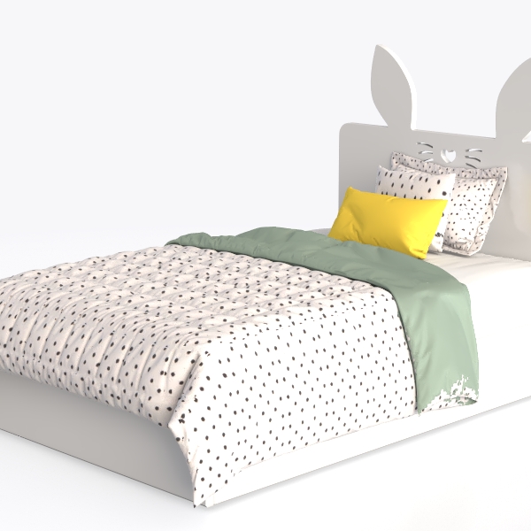 Inspired by playful animal motifs, this bed features a rabbit-ear headboard, blending fun and warmth. Its smooth white surface contrasts with the dotted quilt, light green comforter adding a fresh touch. Perfect for kids' rooms, it pairs with soft lighting and plush decor. Sturdy frame and cozy fabric ensure restful sleep, a charming centerpiece for playful yet serene spaces.